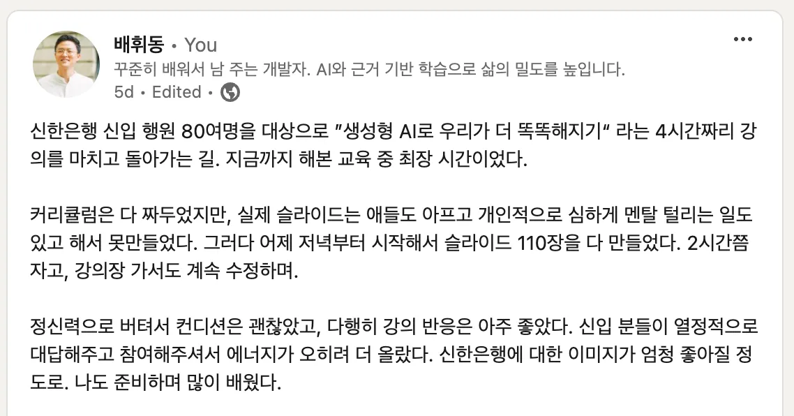 링크드인도 처음에는 쓰레드와 동일하게 소개글을 넣어봤는데 너무 길고 어색했다. 길이를 어떻게 줄일까 고민하다가 회사명을 뺐다. 어차피 프로필 안에 들어오면 잘 보이기도 하고, 날 모르는 사람이 날 팔로우할지 여부에서 “FE Lead @ XL8”이라는 게 특별한 후킹이 되지 못한다고 판단했다.