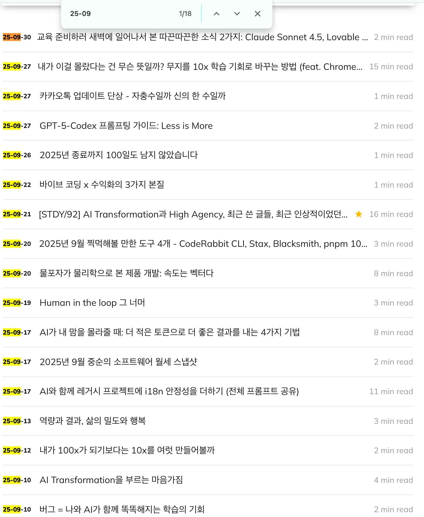 - 의도된, 정성들인 글: 레거시 프로젝트에 안정성 더하기, AI가 내 맘을 몰라줌, 속도는 벡터다, 뉴스레터, 내가 이걸 몰랐다는 것은