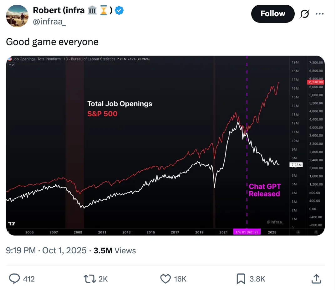 나를 대체하는 게 AI든 AI를 사용하는 인간이든 간에 두려운 것은 마찬가지입니다. 수시로 해고 뉴스가 들려오고, ChatGPT 이후 신규채용은 줄어드는 동시에 S&P 500 지수는 고공행진했다는 트윗이 크게 바이럴되었습니다. 한국의 몇몇 소셜 미디어 게시물은 이 트윗의 이미지를 인용하며 ‘AI의 인력 대체는 거스를 수 없는 흐름’이라는 주장을 펼치기도 했습니다.