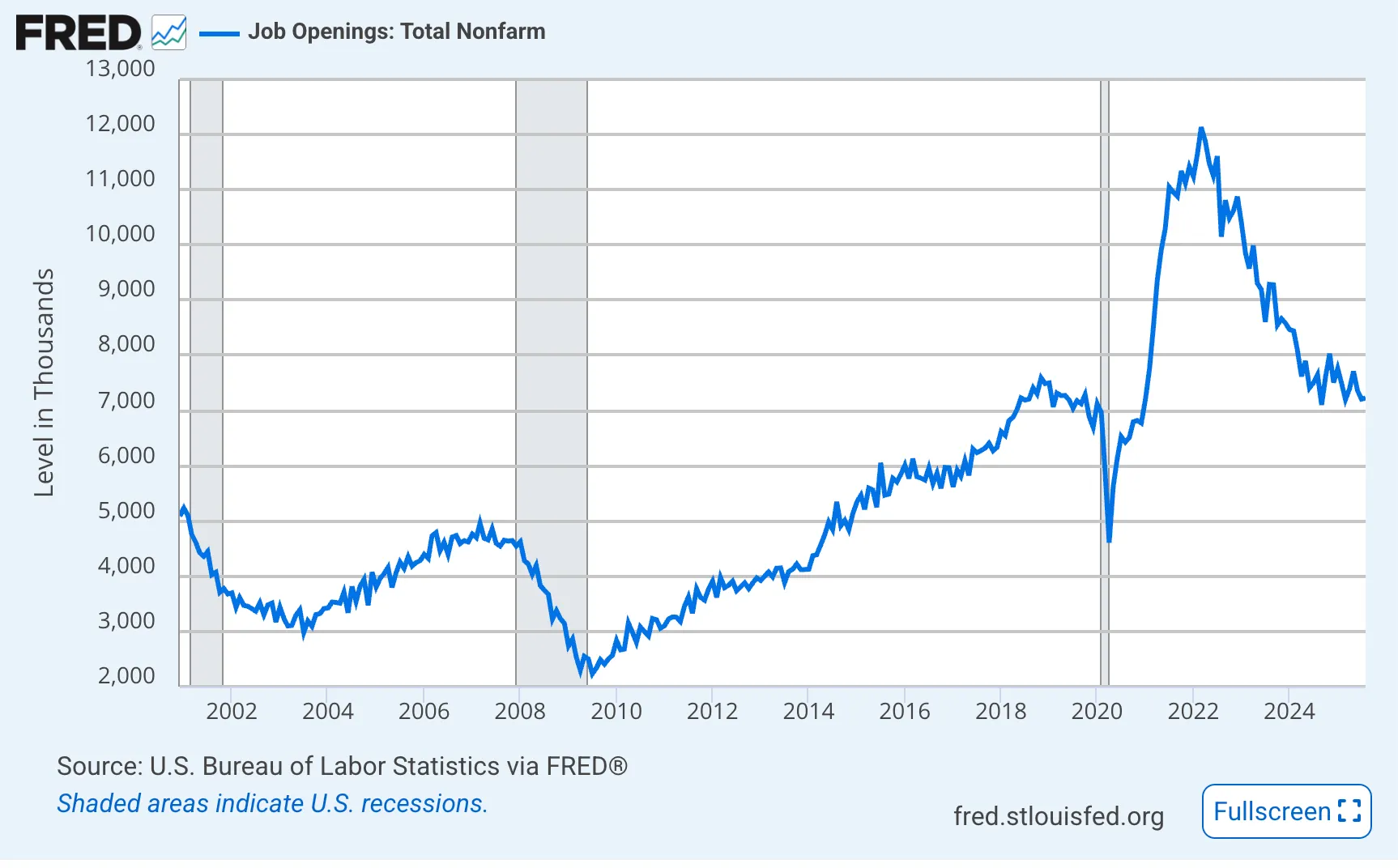 AI의 인력 대체를 단정짓는 글들을 봤을 때도 이 알러지가 올라왔습니다. 그래서 우선 그래프에 찍힌 데이터가 정말인지 확인하고, 그 데이터를 어떻게 해석해야 할지 스스로 판단하고 싶었어요. 이미지에 있던 ‘Job Openings Total Nonfarm Bureau of Labour Statistics’라는 문장으로 구글링하니 FRED(Federal Reserve Economic Data, 미 연방준비은행 경제 데이터베이스)에서 수집한 미국 노동통계국의 통계 데이터 페이지가 나왔습니다.
