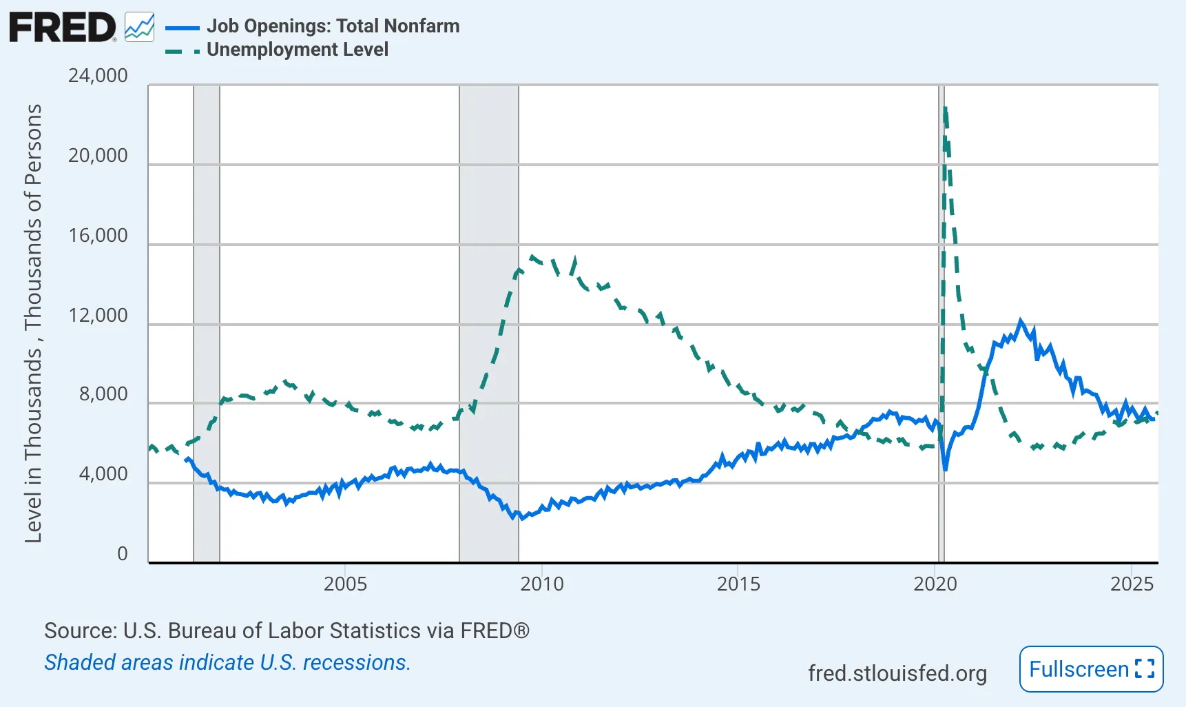- 회색 영역은 21세기 미국에 있었던 3차례 공황(닷컴버블, 서브프라임 모기지, 코로나)을 나타낸다. 다른 공황들만큼이나 2022년부터의 구인공고 감소 폭이 큰데 이 시기는 ‘공황’이라고 부르지 않는다. 왜일까? 이 또한 실업자 통계와 함께 봐야 이해할 수 있겠다.
