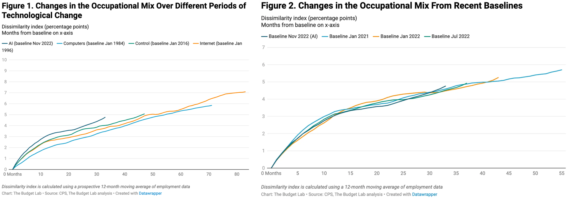 2022년 11월 이후 33개월간, 즉 생성형 AI로 인한 미국 노동시장 변화가 컴퓨터/인터넷 등 과거 기술 혁신 시기의 변화보다 더 급격하다는 증거가 있나?