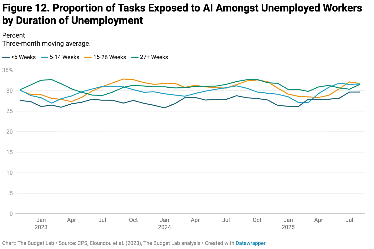그래프를 보면, 실업자들의 실업 기간과 그들의 AI 노출도 사이에는 명확한 추세가 보이지 않습니다. AI 노출도가 높은 직무에서 더 오랫동안 실업 상태에 있는 건 아니었다는 뜻입니다.