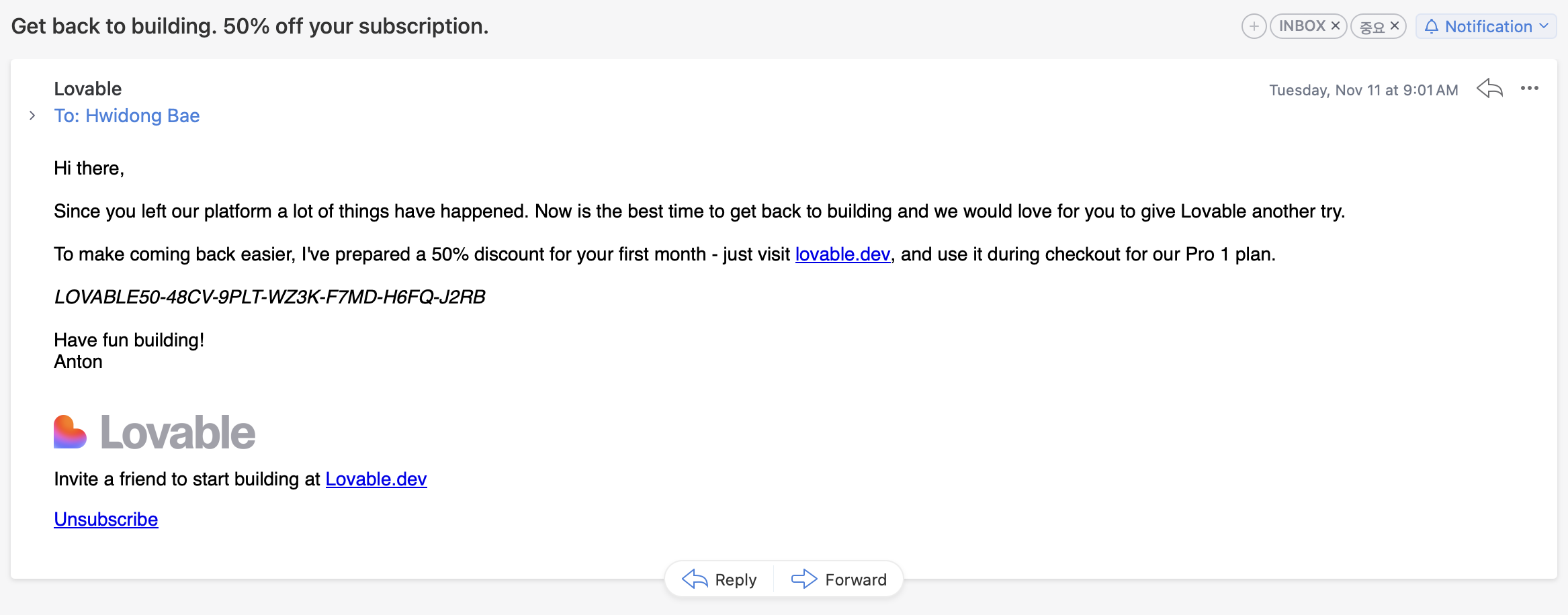 Lovable 몇 달 구독하다가 구독 해지를 하니 이런 마케팅 이메일을 받았습니다.