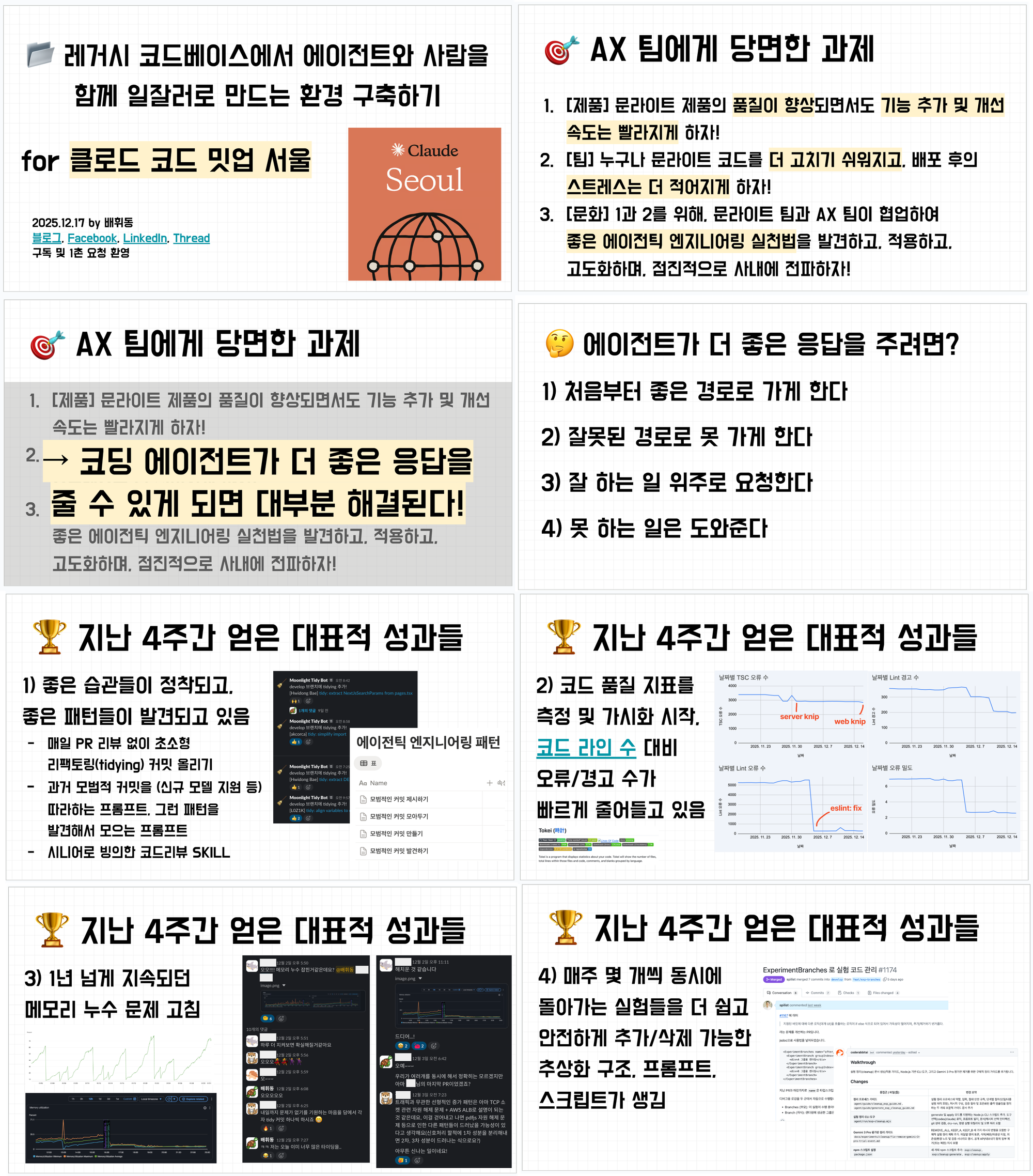 안녕하세요. ”레거시 코드베이스에서 에이전트와 사람을 함께 일잘러로 만드는 환경 구축하기” 발표를 맡은 배휘동입니다. 반갑습니다. 레거시 코드베이스에서 에이전트와 사람을 함께 일잘러로 만드는 환경 구축하기 for 클로드 코드 밋업 서울 2025.12.17 by 배휘동 블로그, Facebook, LinkedIn, Thread 구독 및 1촌 요청 환영