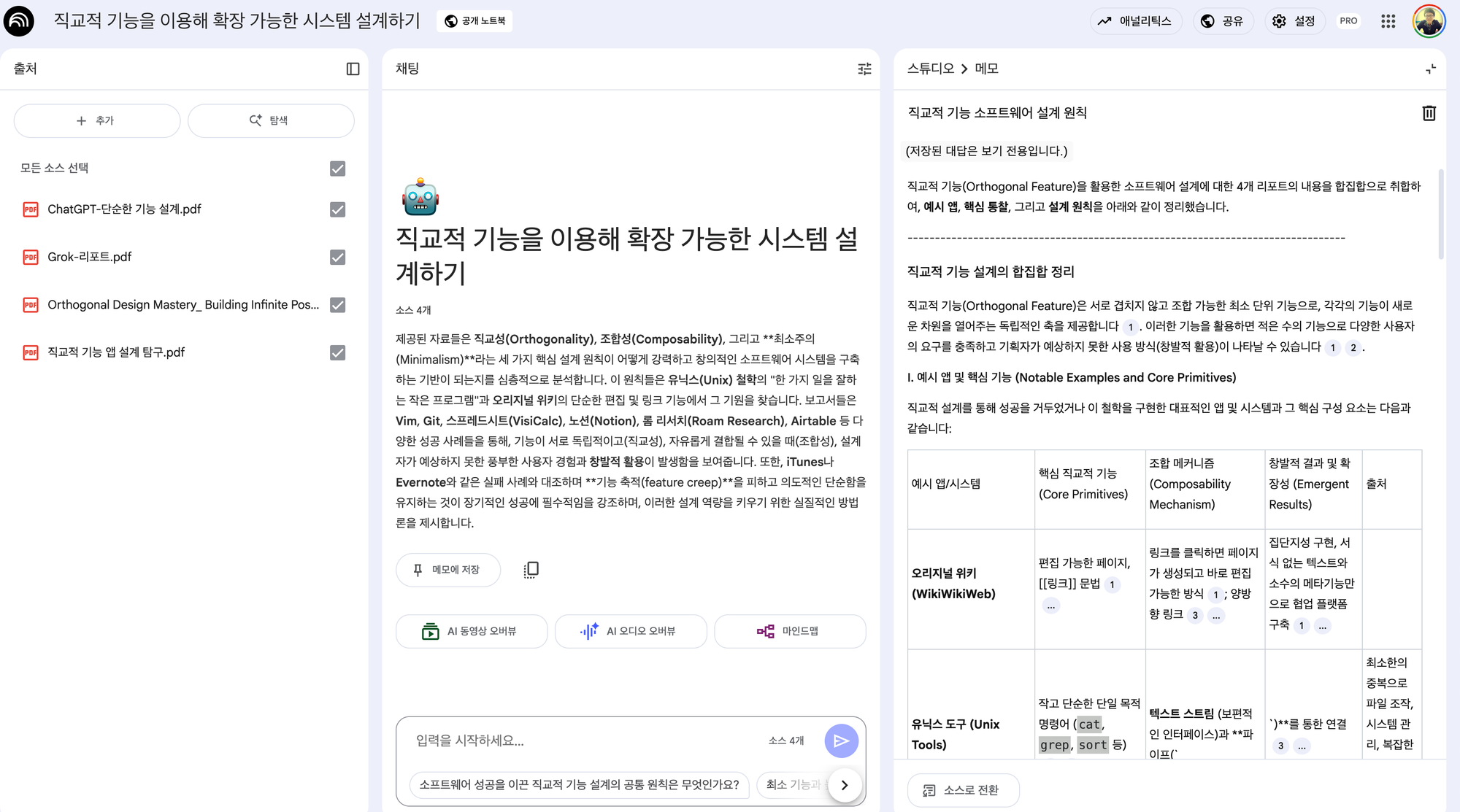학습 재료는 ChatGPT, Grok, Gemini, Claude로 돌린 딥 리서치였습니다. 제가 이걸 꽤 자주 하기 때문에 매번 자동화를 하고 싶은데, 과정에서 얻는 게 많아서 항상 미루게 되네요. 딥 리서치를 위한 프롬프트를 만드는 것 자체도 그렇고, 순차적으로 직접 읽으며 깊이 생각하는 게 다 학습에 큰 도움이 됩니다.