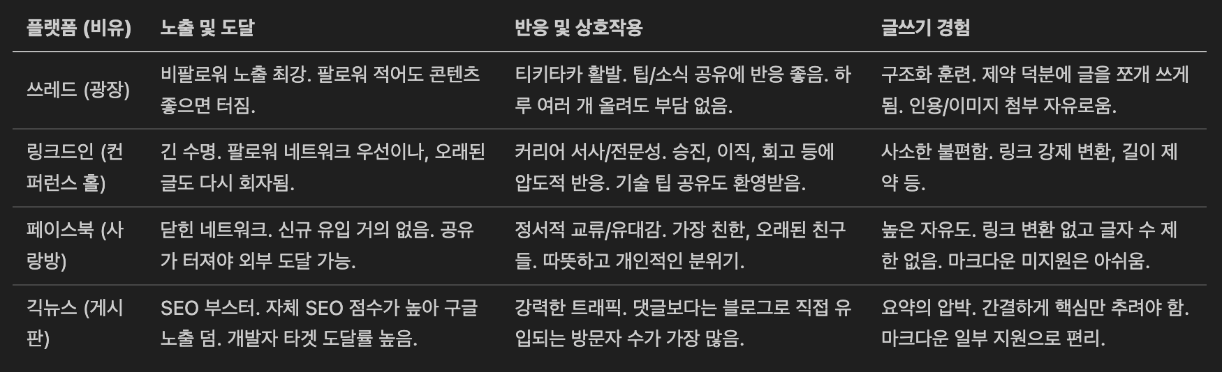 질문받은 김에 제가 느낀 각 채널별 특징, 그리고 POSSE의 매력에 대해 짧게 적어봤습니다. 참고로 제가 주로 쓰는 개발/AI 관련 글과 오디언스 기준이라서 지극히 개인적인 내용임을 감안해주세요.
