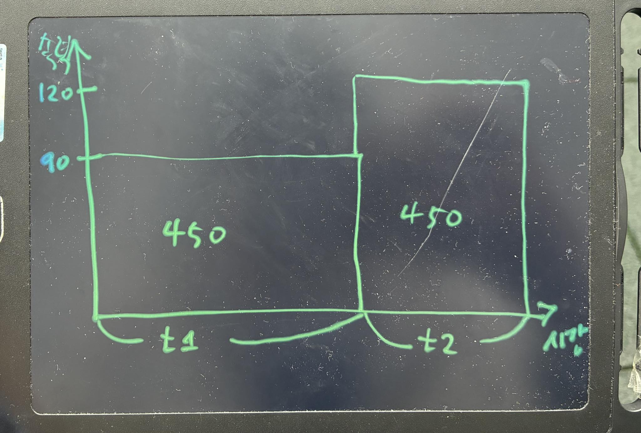 여기서 평균속력이란 총 시간 (t1 + t2) 는 고정해둔 채 넓이가 900이 되는 속력을 뜻하는데, 조카가 생각한 것처럼 (90 + 120)의 절반인 105가 답이 되려면 t1과 t2가 동일해야 하는데, 실제로는 그렇지 않죠.