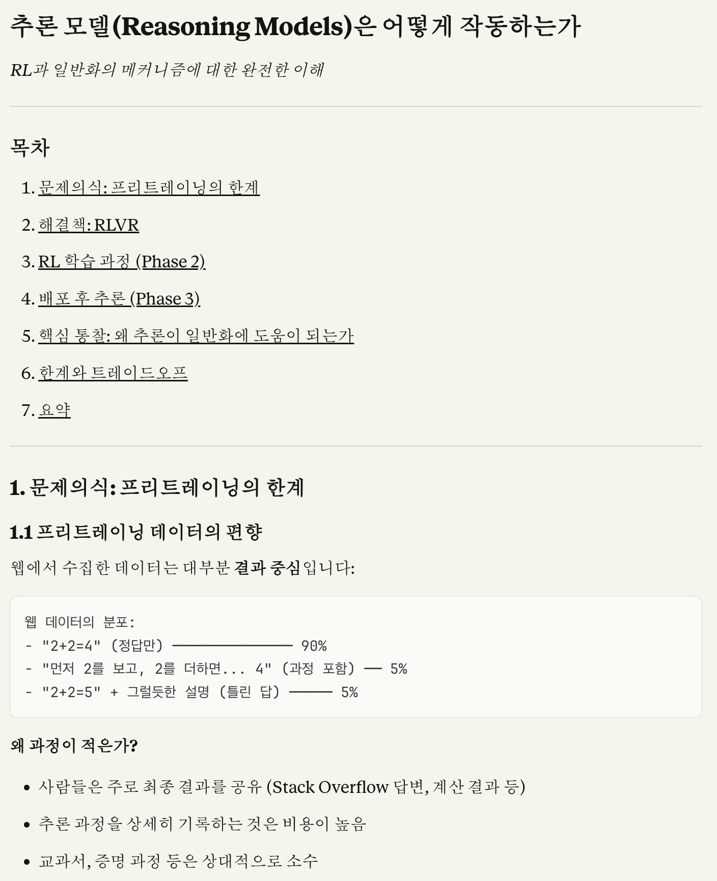 영상 시청을 끝낸 뒤, 특히 어려웠던 RLVR에 관련된 내용에 대해 제가 이해한 바를 적어보다가 역시나 이해가 명확하지 않음을 알게 됐습니다. 그래서 그 적어본 내용을 그대로 Claude에 넣고 학습 모드로 40분 넘게 대화를 나눴어요. 덕분에 이해도가 많이 올라왔습니다. (참고로 유튜브 링크나 트랜스크립트는 넣지 않았습니다)