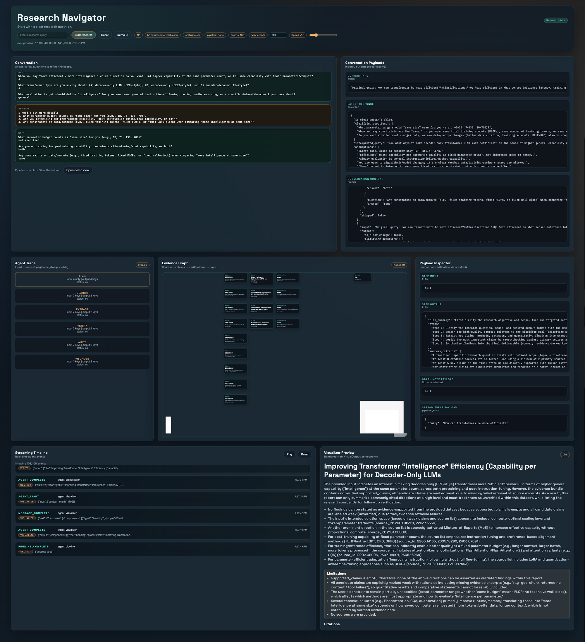 - 우리는 Planner-Executer-Verifier 패턴을 쓴 셈인데, Verifier 루프가 도는 데 시간이 너무 오래 걸려서 직접 검증이 굉장히 힘들어졌다. 비록 우리의 실제 고객은 좀 더 오래 걸려도 품질이 높은 게 좋았겠지만, 데모에서는 루프 횟수의 상한을 더 줄이거나, 속도가 더 빠른 모델을 썼어야 했다.