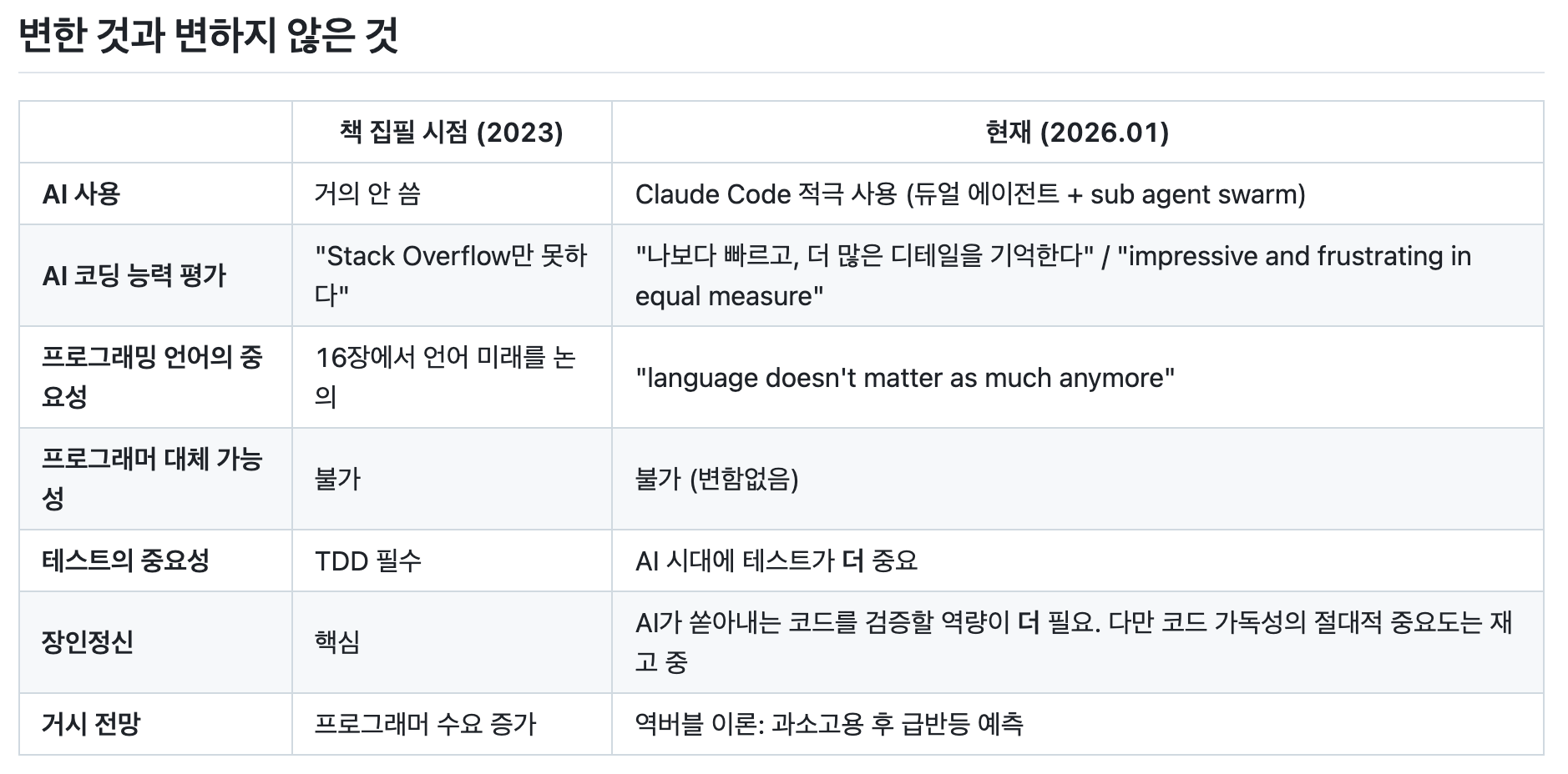 AI에 의한 개발자 대체론(나아가 인간 대체론)은 근래 단순한 불안 수준을 넘어선 것 같습니다. 저는 아직 안 써봤습니다만 OpenClaw(구 MoltBot, 구구 Clawdbot)이 크게 바이럴되면서 더 그런 분위기가 강해지는 것 같고요. 하지만 저는 책의 이러한 핵심 주장에 동의합니다.
