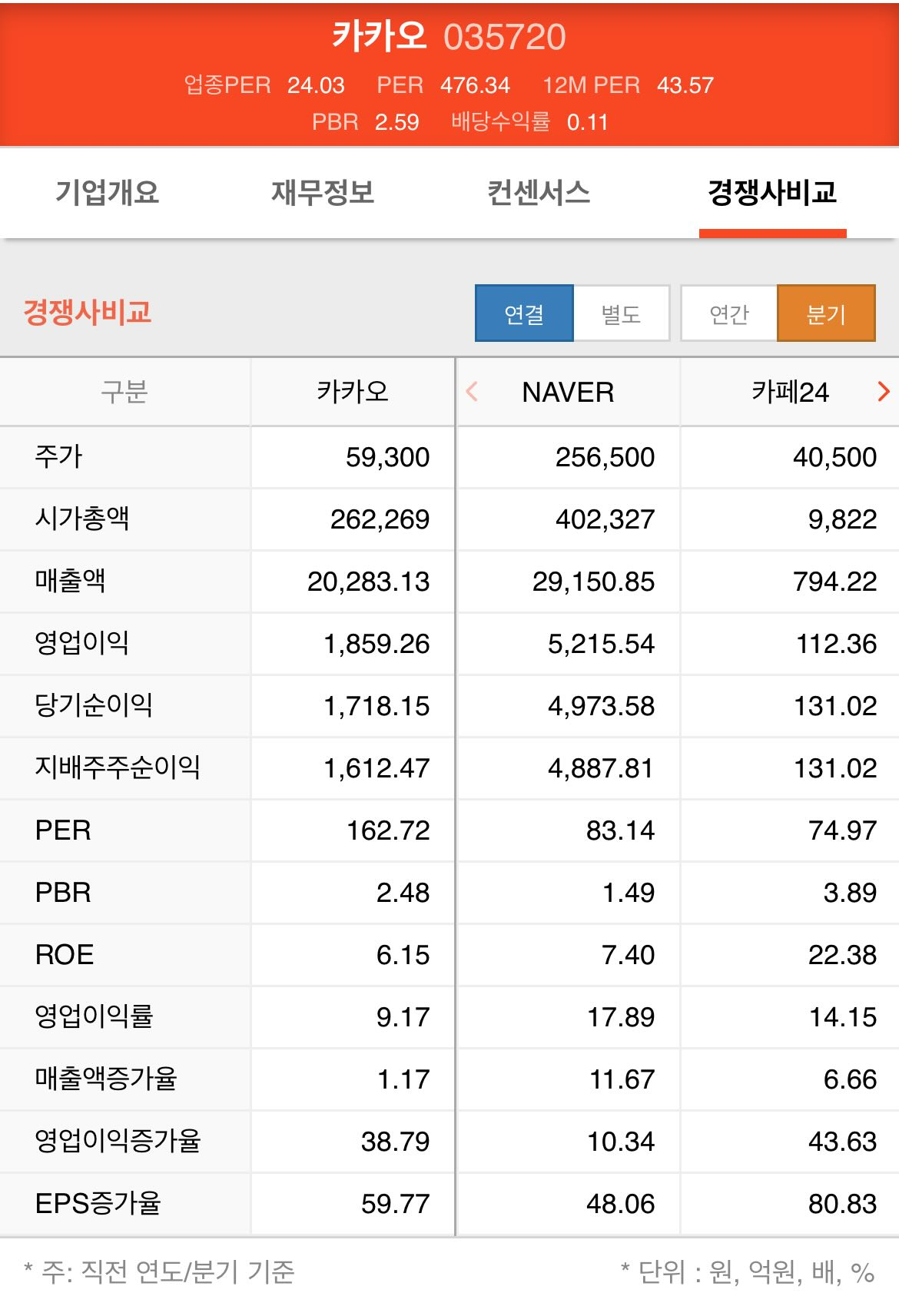 업데이트의 호오와 별개로 카카오의 광고매출은 많이 오를 거라는 이야기에 공감해서, 이번에 빠진 김에 좀 담아볼까 했는데 여전히 네이버와의 PER 차이가 어마어마하네요. 기존에 이렇게 수익이 적었는지 몰랐습니다. 일단 지켜만 보는 것으로…