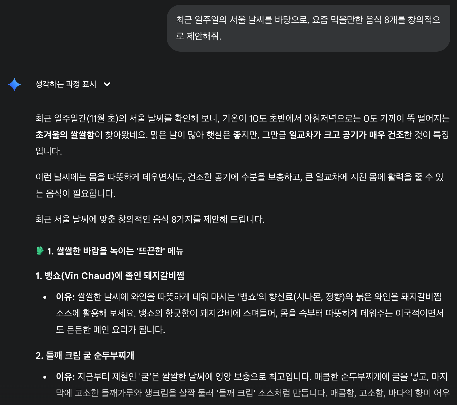 Gemini에 가서 모델을 2.5 Pro 로 설정하고 이런 식으로 입력합니다. (Gemini의 새 모델이 나온다면 그걸로 하시면 더 좋겠네요. 아무튼 Flash만 아니면 됩니다) 저는 음식으로 했지만 당연히 원하시는 대로 vs 대결을 펼치셔도 됩니다.
