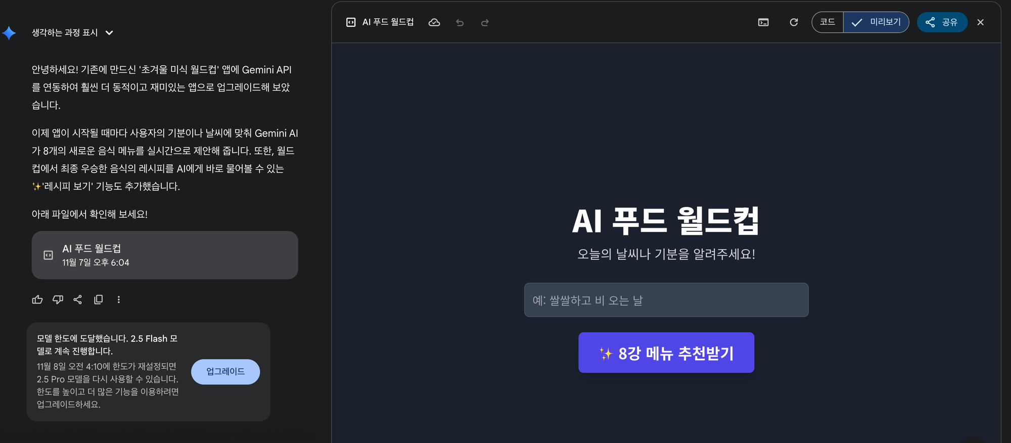 당연히 Gemini 기능이 아닌 다른 변경(색깔 변경, 문구 변경, 다양한 기능 추가 등)도 원하는대로 채팅으로 요청할 수 있습니다. 단, 이쯤 되면 무료 버전에서는 Pro 모델을 특정 시점까지는 더 쓸 수 없다는 메시지가 떴을지도 모르겠네요.