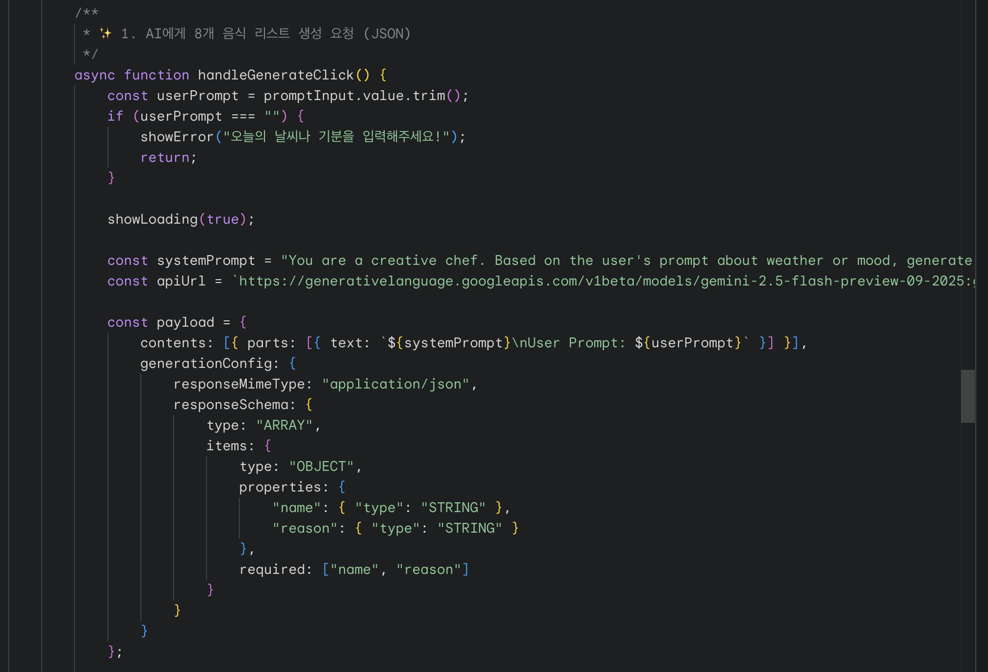 실제로 Gemini Canvas에서 생성된 코드 내부를 보면 gemini-2.5-flash-preview-09-2025 모델에게 API를 호출하여, 사용자 입력에 맞는 메뉴를 추천받게 되어있습니다. 이게 가능한 이유는 Gemini에서 무료로 API Key를 제공하기 때문입니다. 원래는 이러한 LLM 기능을 사용하려면 API의 사용 비용을 지불해야 하는데, (아마도 고객 유치의 일환으로) 구글은 Gemini Canvas의 '미리보기'에서는 API를 체험해볼 수 있도록 해주는 거죠.