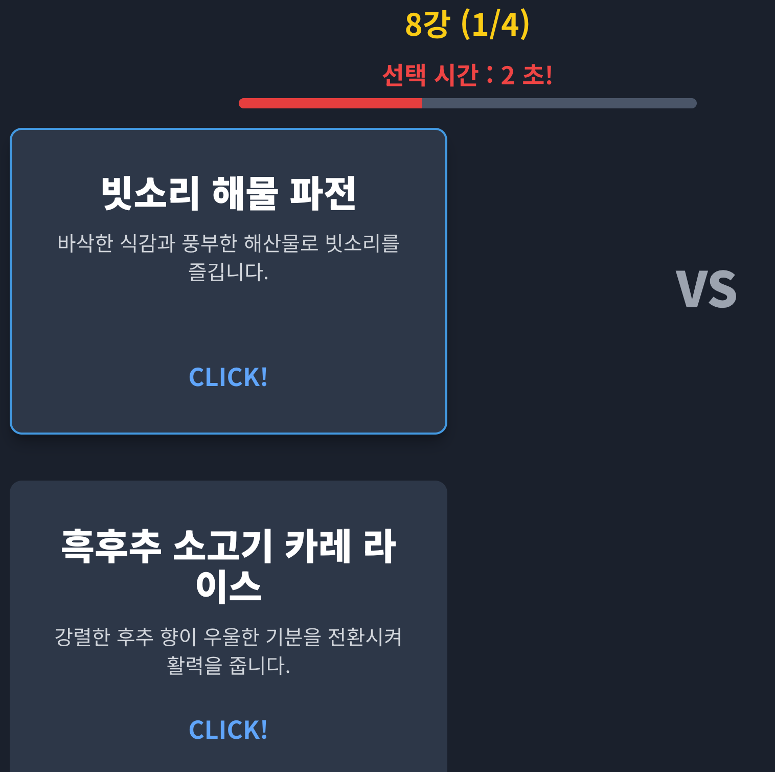 네가 제안한 음식 8개에 대해 이상형 월드컵을 만들어줘. 음식 이름이 크게 나오고, 아래에는 추천 이유를 간단하게 적어줘. 음식 이미지는 안 나와도 돼. 빠른 선택을 종용하는 박진감 요소도 추가해줘.