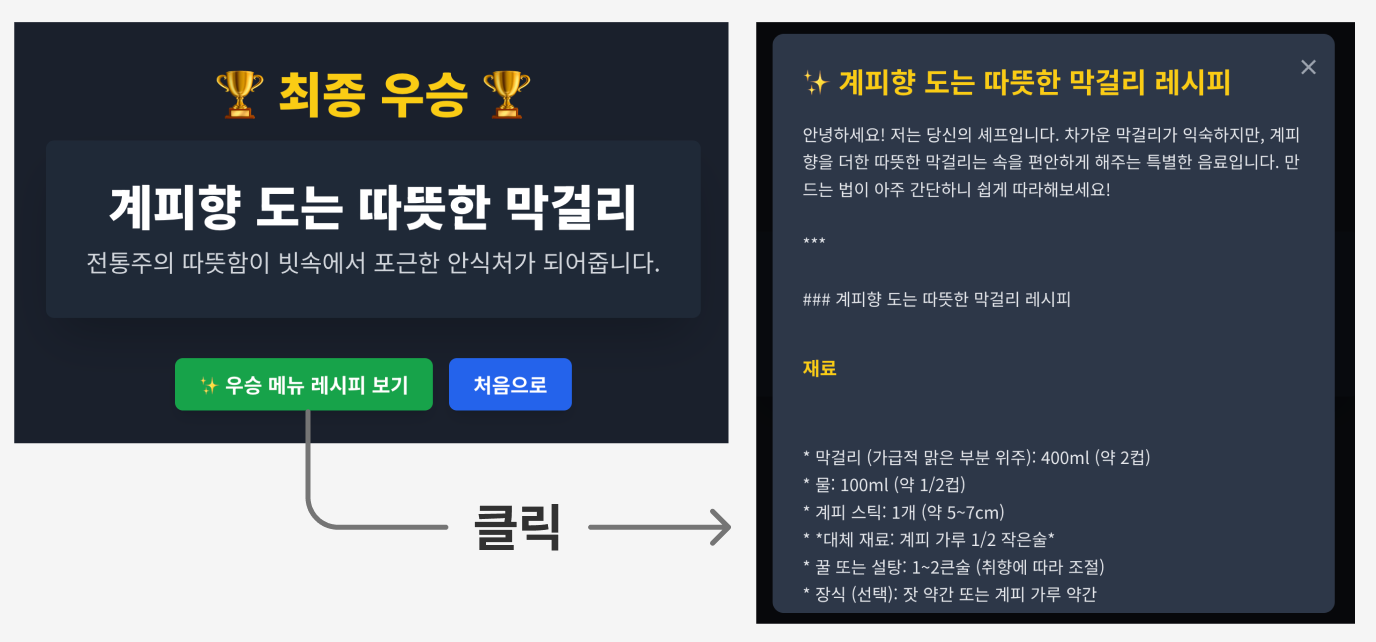 그랬더니 아래와 같이 우승 메뉴 레시피 보기 버튼이 생겼고, 클릭해서 잠깐 기다리니 레시피를 주네요.