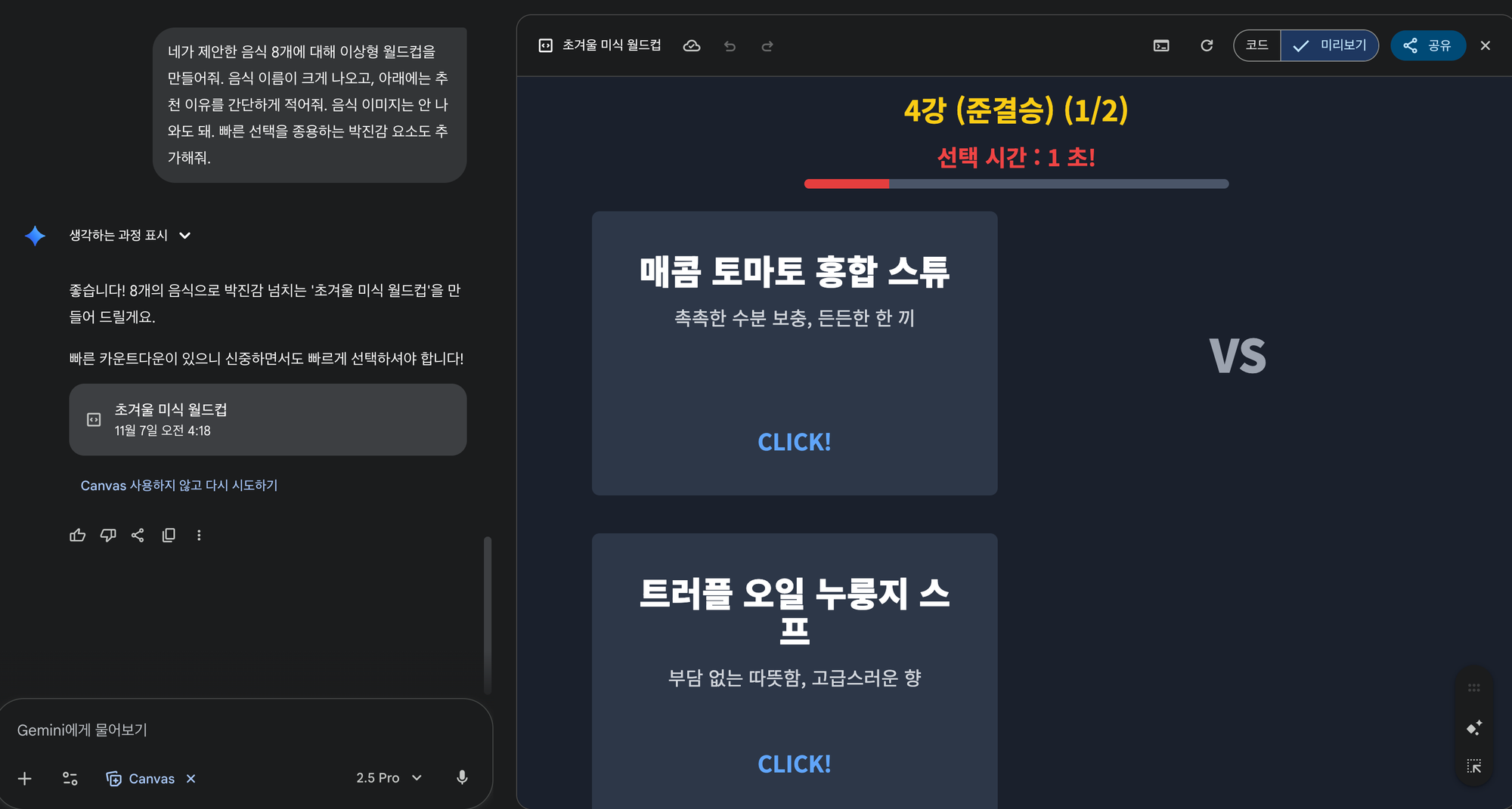 이런 간단한 명령만으로 웹앱 하나가 나오는 건 Gemini가 '이상형 월드컵'이라는 개념을 잘 알고 있기 때문에 가능합니다. 원래는 프로그램이 어떻게 동작해야 하는지, 어떤 목적을 달성하기 위한 프로그램인지 등을 설명해야 하죠.