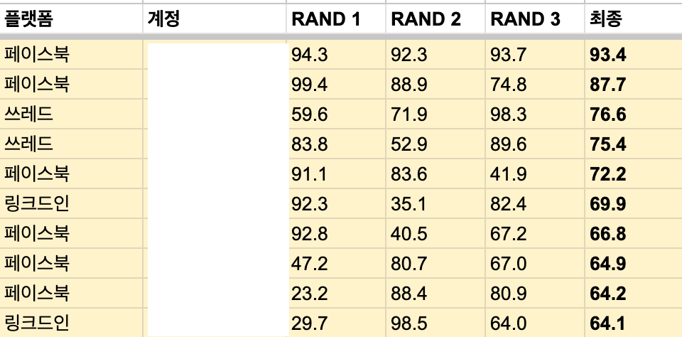 당첨자는 구글 스프레드시트 랜덤 함수를 3번 돌린 숫자의 평균이 가장 높은 10명으로 정했습니다. 플랫폼별 참여 비율은 대략 (5.7 : 2.5 : 1.8) 인데, 기막히게 그 비율대로 6명 2명 2명이 뽑혔네요. 당첨되신 분들 축하드리고, 한분한분 DM으로 배송 정보 수집을 위한 구글 폼을 보내드릴 예정입니다.