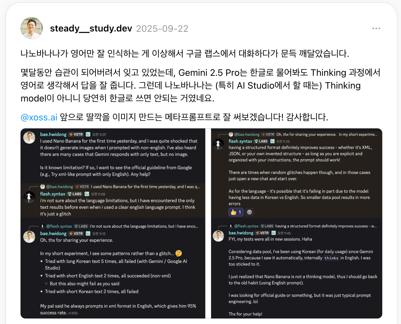 나노바나나가 영어만 잘 인식하는 게 이상해서 구글 랩스에서 대화하다가 문득 깨달았습니다. 몇달동안 습관이 되어버려서 잊고 있었는데, Gemini 2.5 Pro는 한글로 물어봐도 Thinking 과정에서 영어로 생각해서 답을 잘 줍니다. 그런데 나노바나나는 (특히 AI Studio에서 할 때는) Thinking model이 아니니 당연히 한글로 쓰면 안되는 거였네요. @xoss.ai 앞으로 딸깍을 이미지 만드는 메타프롬프트로 잘 써보겠습니다! 감사합니다.