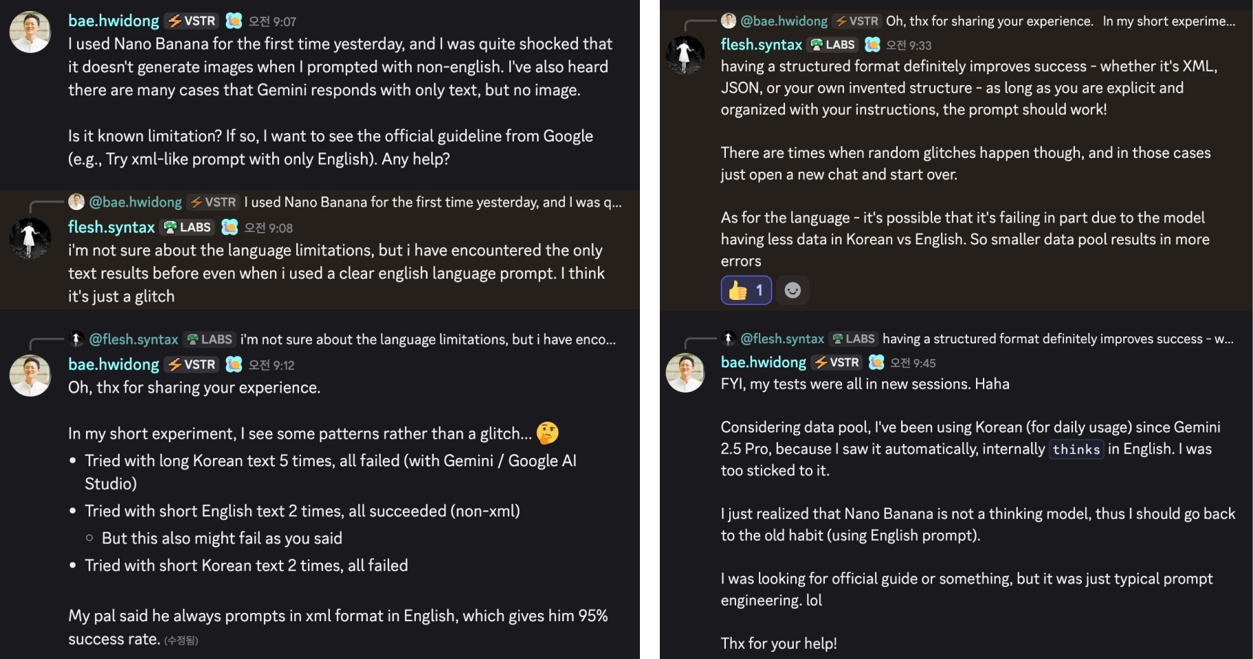 9월 말에 처음으로 나노바나나를 써보면서, 의도대로 동작하질 않길래 SNS와 공식 디스코드를 통해 질문하며 이해도를 높였던 기록을 남겨둡니다. 여담이지만 이것들이 제가 지식을 빠르게 습득하는 몇 가지 주요한 경로네요.