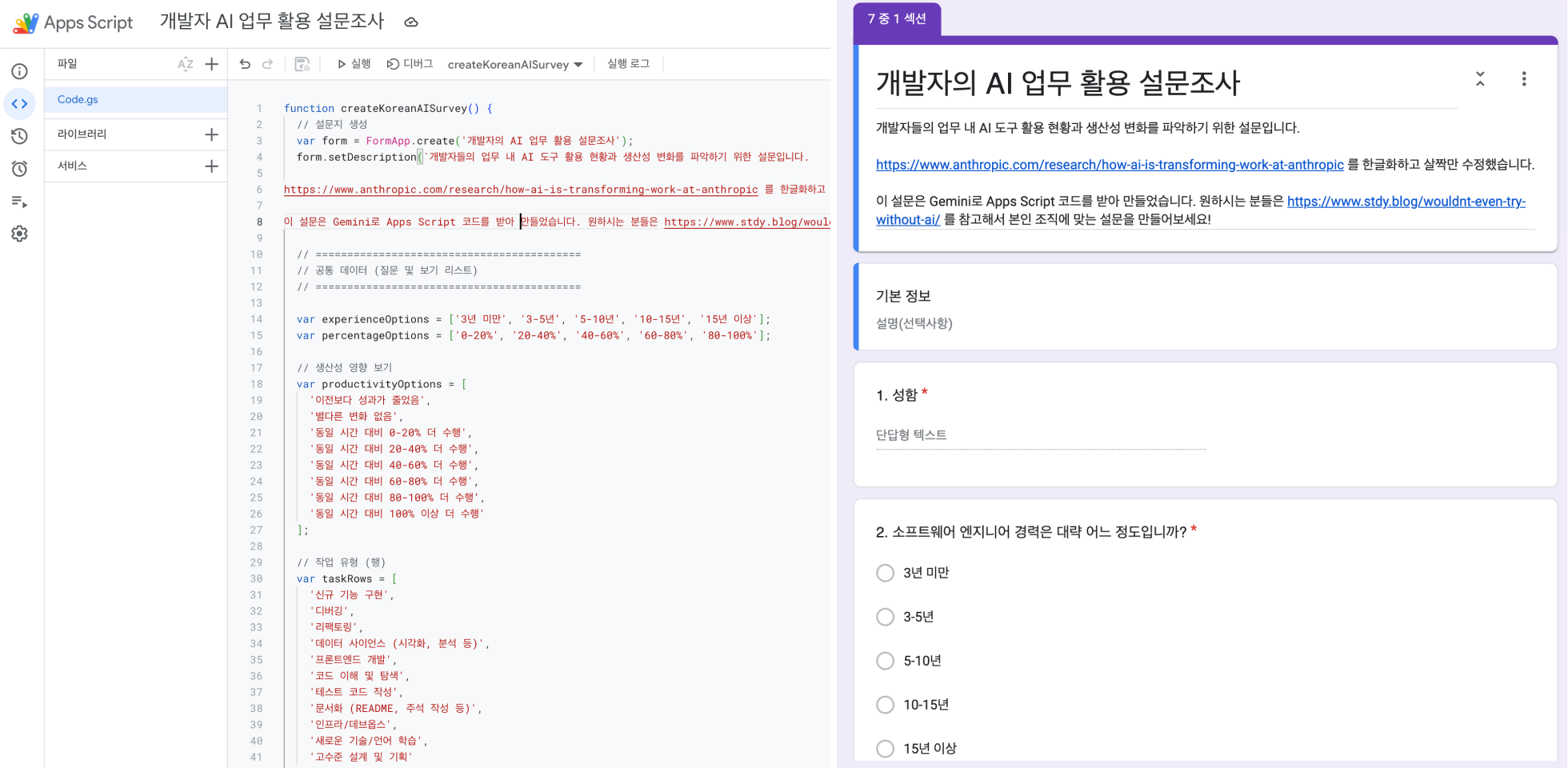 그 결과 아래 이미지의 좌측과 같은 코드가 생성됐고, 실행해보니 그럴듯한 구글 폼이 만들어졌습니다. (사실은 첫 턴에 바로 된 건 아니고 실행해보니 에러가 나서, 에러 붙여넣어주니 새 코드를 줬고요. 그 뒤 텍스트를 조금 수정해서 완성했습니다) Apps Script가 좋다는 건 알았지만 이걸로 구글 폼을 만들어볼 생각은 안 했었거든요. 시야가 확 열리는, 아주 신선한 경험이었어요. (폼 링크)